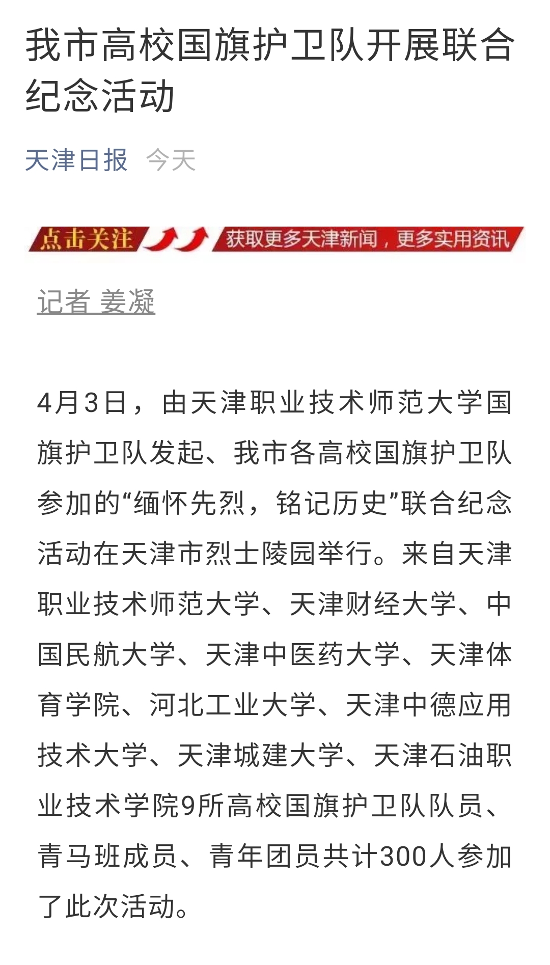 《天津日报》:我市高校国旗护卫队开展联合纪念活动 赓续英烈精神 汲取奋进力量
